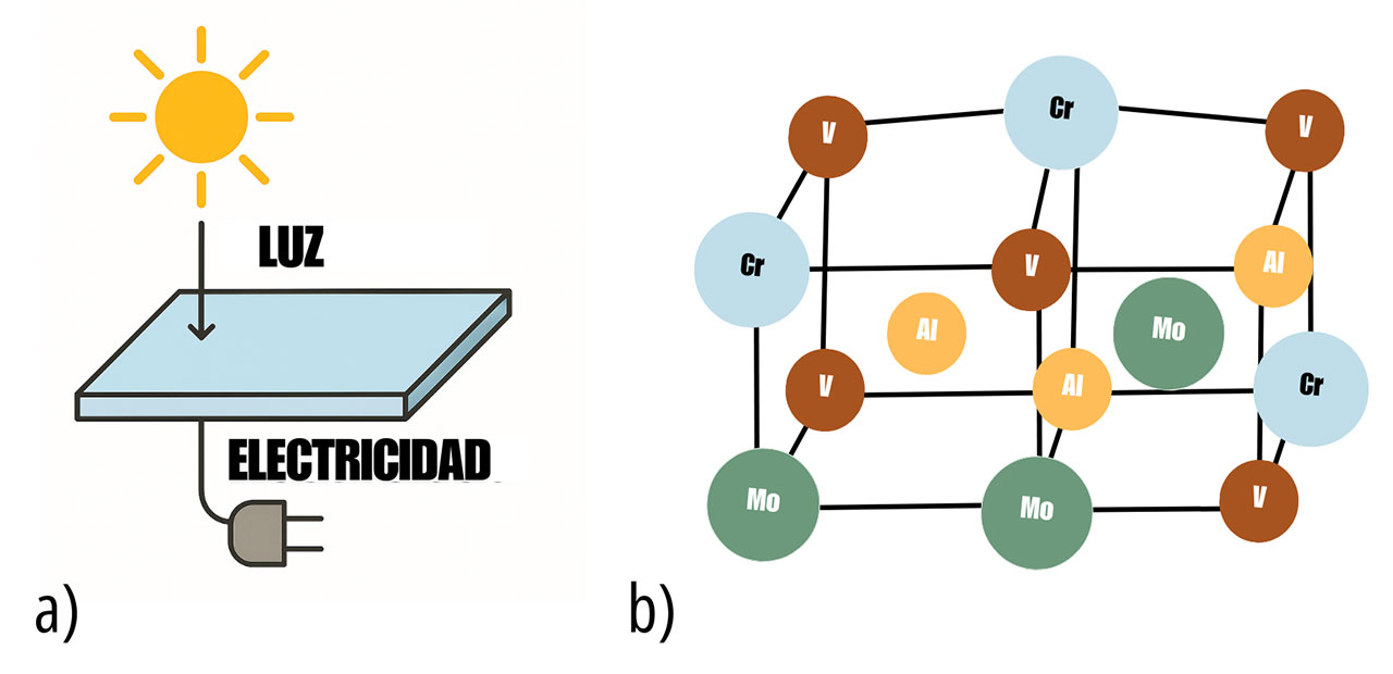 Figura 1. a) TOC: de la luz a la electricidad, b) HEA: configuración y estructura cristalina. TOC: óxido conductor transparente, HEA: aleación de alta entropía.