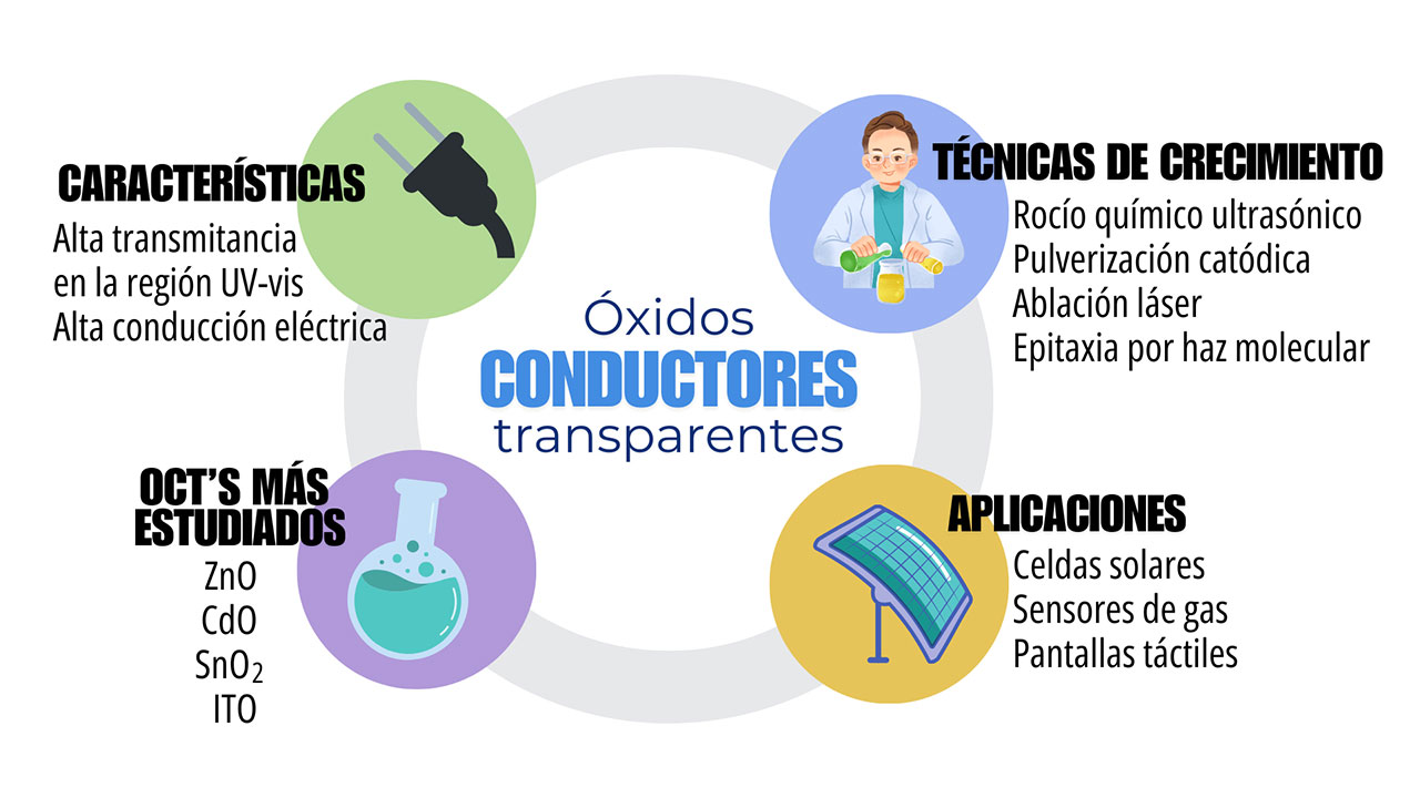 Figura 2. Resumen gráfico de las características, aplicaciones, técnicas de crecimiento y principales óxidos conductores transparentes estudiados.