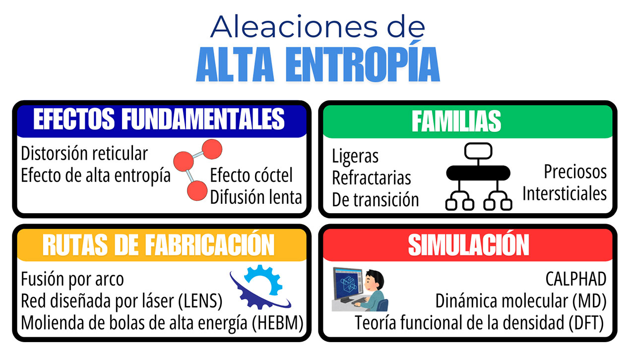 Figura 3. Resumen gráfico de los efectos fundamentales, rutas de fabricación más empleadas, técnicas computacionales para la simulación y clasificación de las aleaciones de alta entropía.