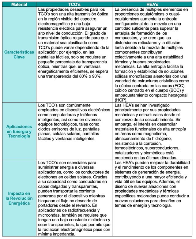 Aunque los mecanismos que definen su funcionalidad y aplicaciones varían, tanto los TCO’s como las HEA’s comparten el enfoque de optimizar y combinar propiedades específicas para adaptarse a aplicaciones concretas. Ambos materiales son fundamentales en la transformación del sector energético. La tabla 1 destaca las características distintivas de cada uno, las cuales están impulsando cambios significativos en diferentes áreas de la industria energética y tecnológica.
