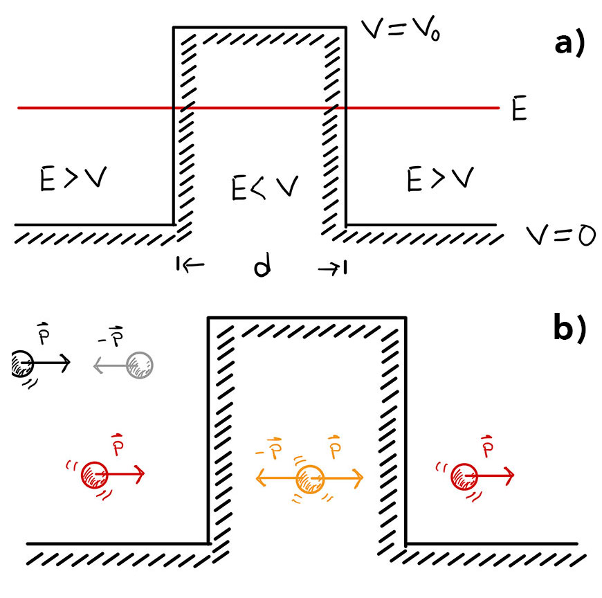 Figura 1. (a) La región d al interior de la barrera de potencial está prohibida clásicamente cuando la energía mecánica total de la partícula es inferior a la altura del potencial (E<V0). Fuera de dicha región la partícula se mueve con momento lineal P=mv. (b) Una partícula clásica que se mueve de izquierda a derecha con momento lineal P cambia la dirección de su movimiento al llegar a la región clásicamente prohibida, por lo que queda confinada a moverse solo a la izquierda de la barrera de potencial (partículas en negro y gris). El confinamiento clásico no aplica si se trata de una partícula cuántica (caricaturizada en rojo y naranja). La partícula puede ocupar la región clásicamente prohibida, incluso atravesándola por completo para continuar su movimiento hacia la derecha, más allá de la barrera de potencial. Esto último se conoce como efecto túnel.[/caption]