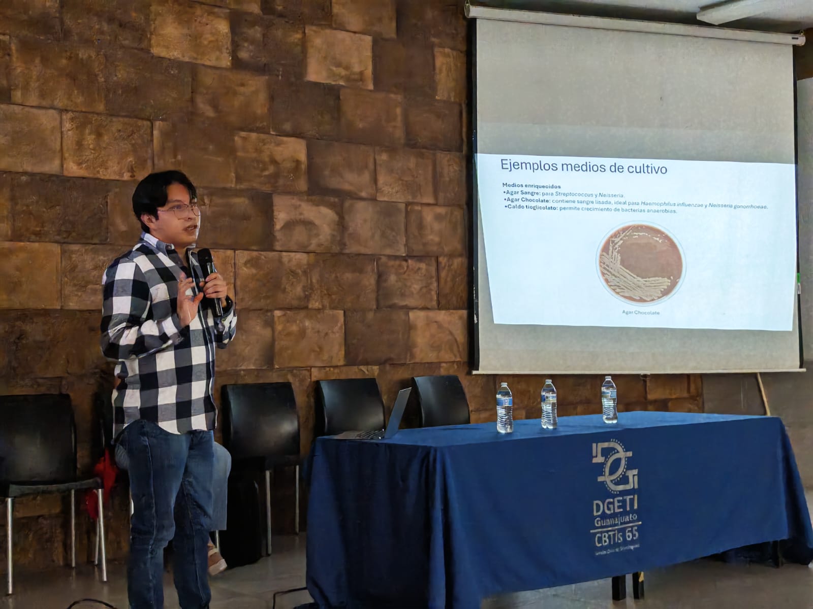 En una destacada jornada de vinculación, miembros del Cinvestav Irapuato visitaron el Centro de Bachillerato Tecnológico Industrial y de Servicios (CBTis) No. 65 los días 15 y 17 de octubre de 2025 para impartir la conferencia “Técnicas de identificación de microorganismos”, en el marco del programa de fortalecimiento académico y vinculación institucional. La actividad estuvo dirigida a estudiantes de tercer semestre de la especialidad de Laboratorista Clínico, con el propósito de acercarlos al quehacer científico y mostrar la aplicación práctica de diversas metodologías utilizadas en los laboratorios de investigación.