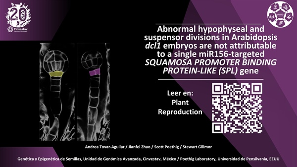 Te invitamos a leer el artículo "Abnormal hypophyseal and suspensor divisions in Arabidopsis dcl1 embryos are not attributable to a single miR156-targeted SQUAMOSA PROMOTER BINDING PROTEIN-LIKE (SPL) gene, but likely involve redundan" publicado en Plant Reproduction, a cargo del profesor investigador de la Unidad de Genómica Avanzada del Cinvestav Dr. Stewart Gillmor, Profesor Investigador de la UGA.
