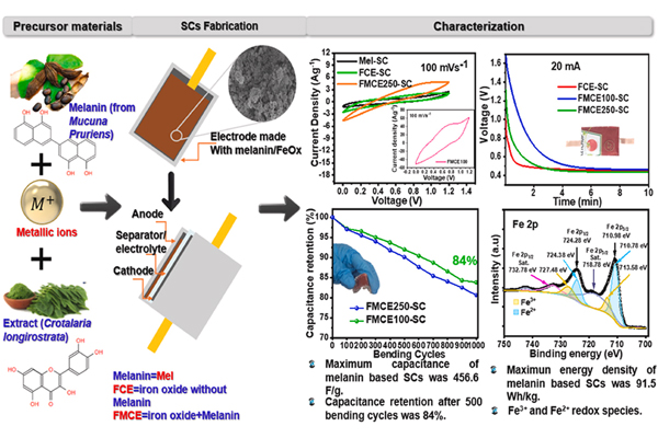 The role of green redox powder (melanin) to enhance the capacitance of graphene/FeOx based supercapacitors