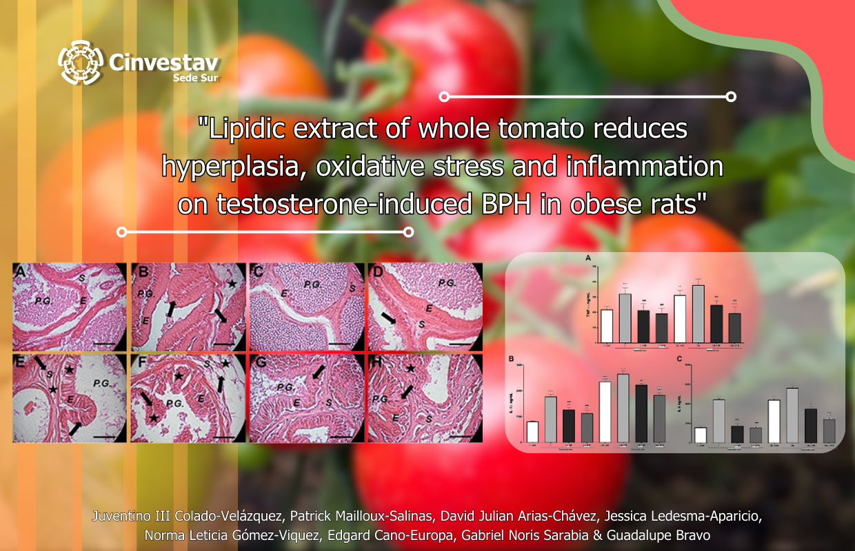 Invitamos a leer el artículo: “Lipidic extract of whole tomato reduces hyperplasia, oxidative stress and inflammation on testosterone-induced BPH in obese rats”, en la que colaboró la Doctora Guadalupe Bravo, Investigadora de Cinvestav Sede Sur