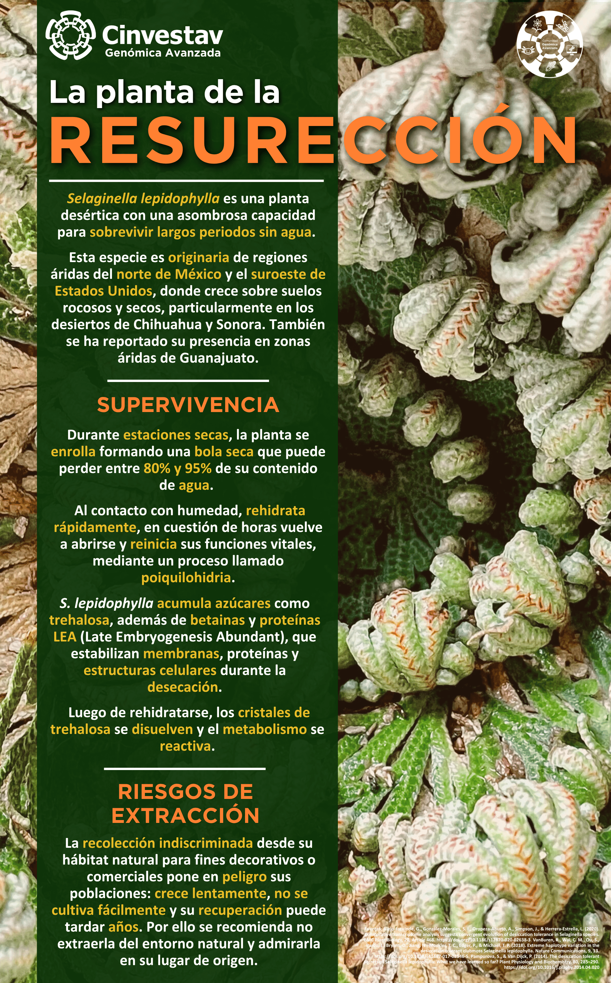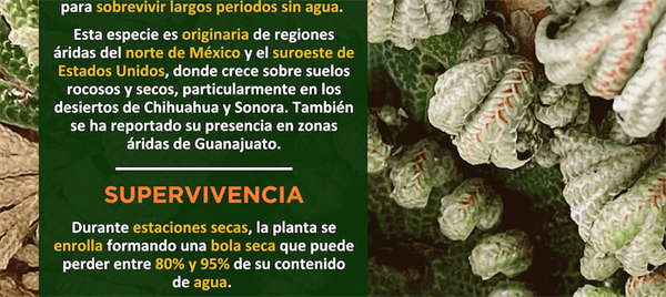 Selaginella lepidophylla es una planta desértica que ha desarrollado una impresionante capacidad para tolerar la desecación. En condiciones extremas, puede secarse casi por completo y permanecer en estado latente durante años. Cuando vuelve a tener acceso al agua, se rehidrata y reactiva su metabolismo en pocas horas.