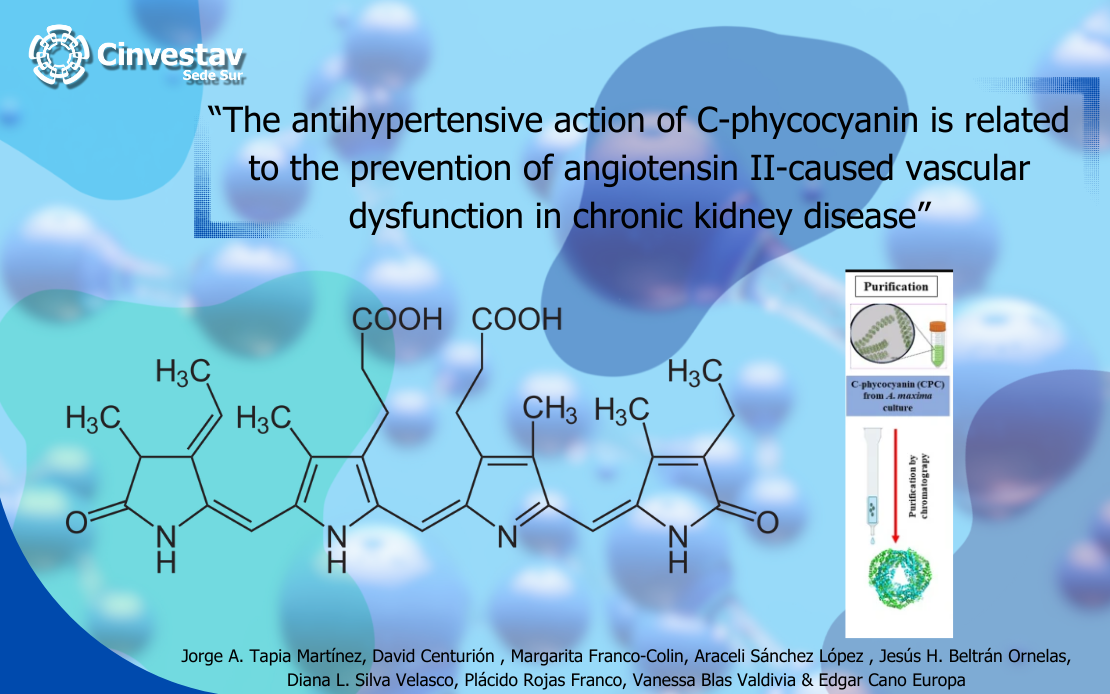 Invitamos a leer el artículo: " The antihypertensive action of C-phycocyanin is related to the prevention of angiotensin II-caused vascular dysfunction in chronic kidney disease", realizado por el Dr. David Centurión, Investigador de Cinvestav Sede Sur